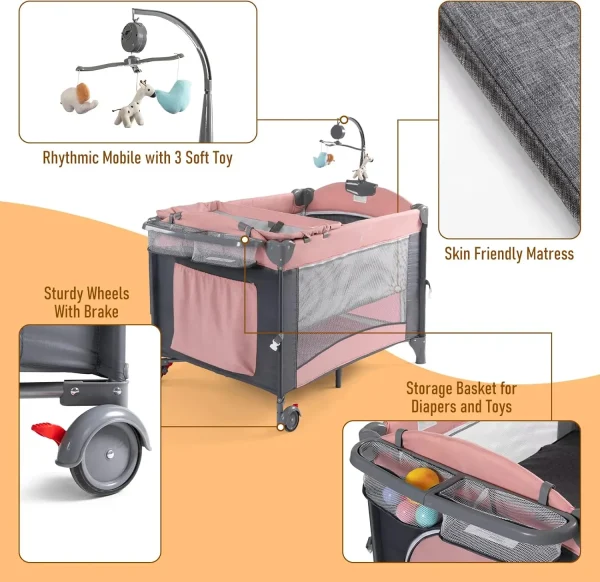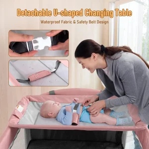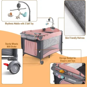 5 in 1 Baby Crib, Bassinet Beside Sleeper, Pack and Play with Bassinet and Changing Table Portable Travel Playpen